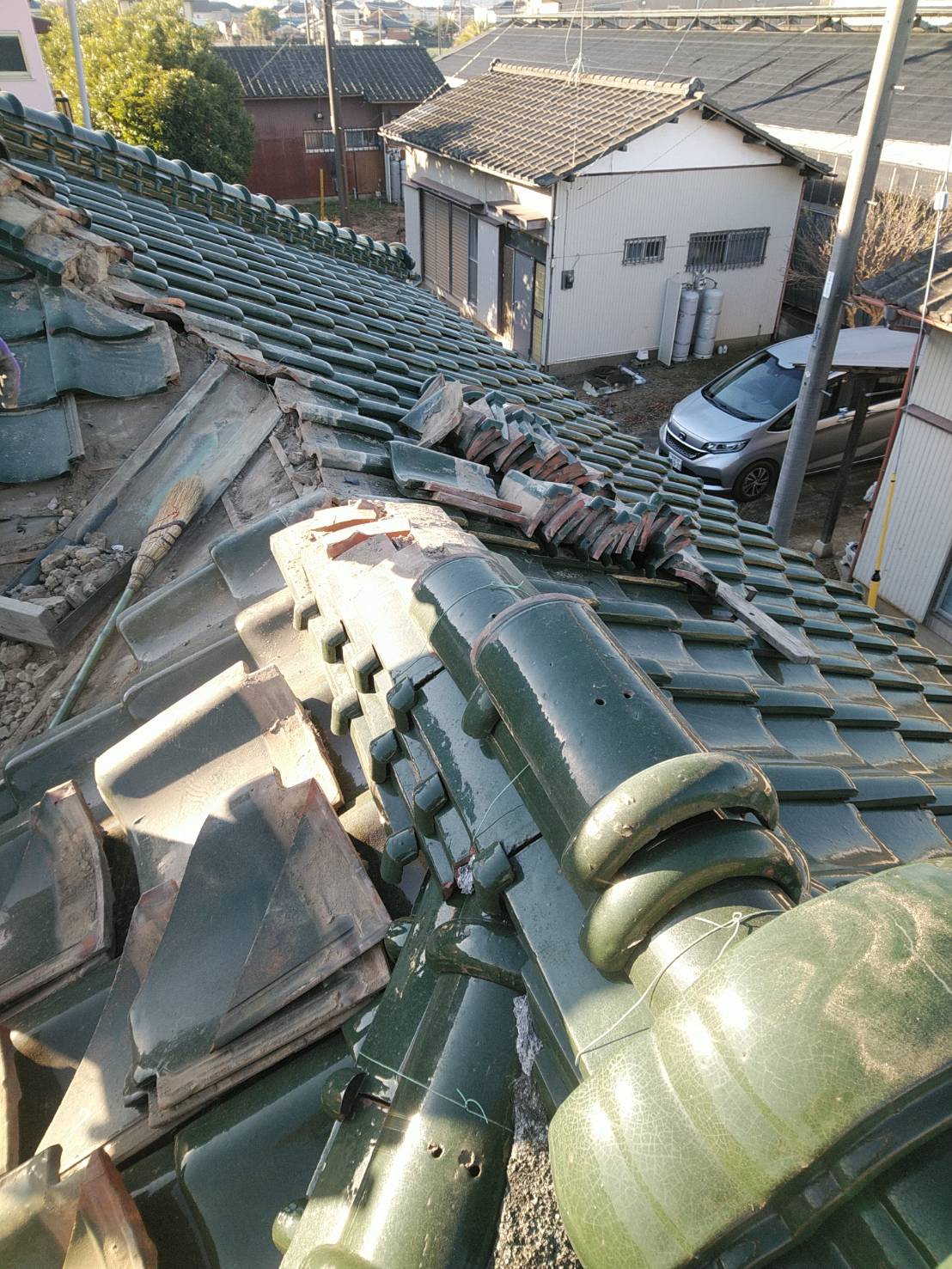 築43年の本建築入母屋造りの建物です。何年か前の台風であちこちズレやめくれたりしているので修理してください、と依頼があり工事伺いま…