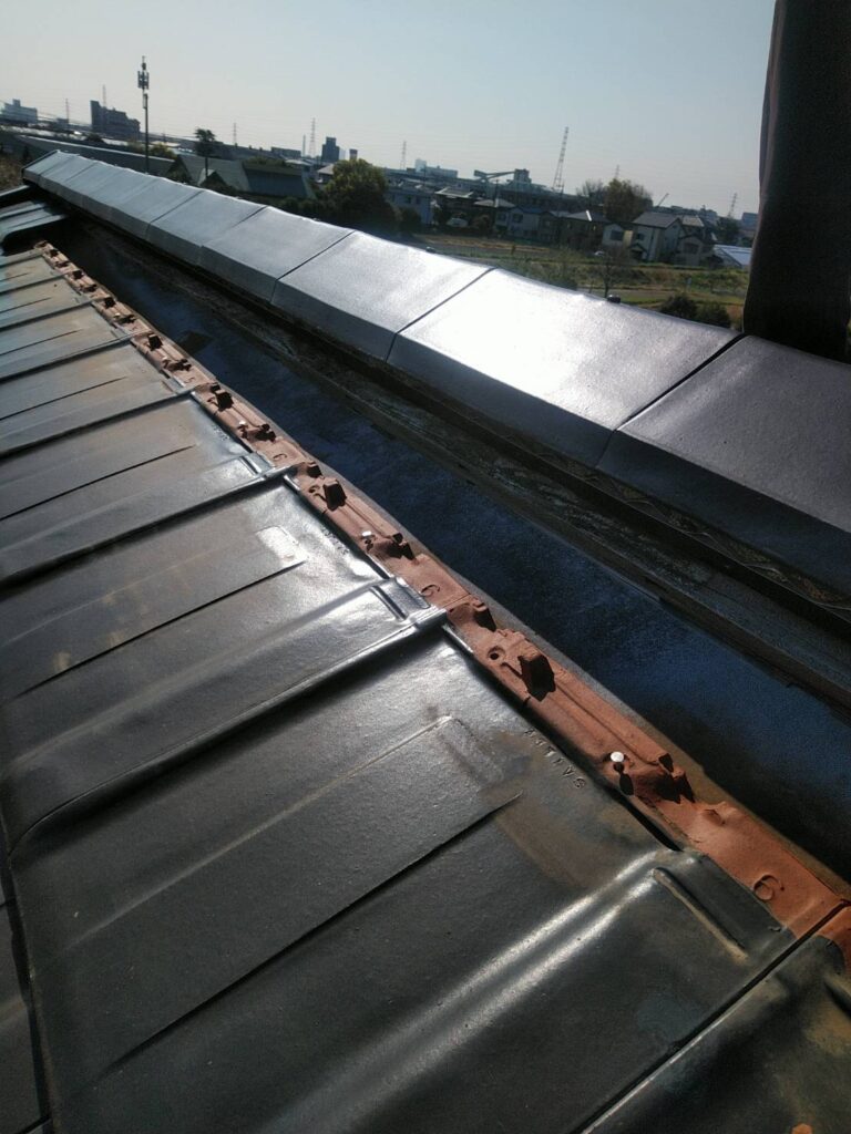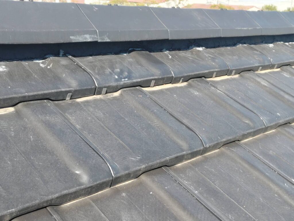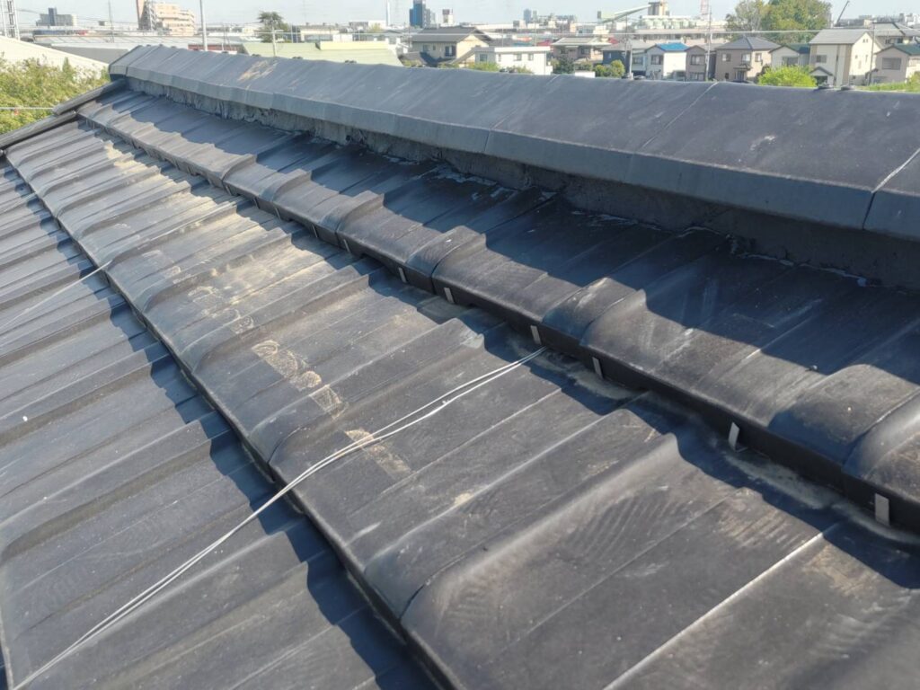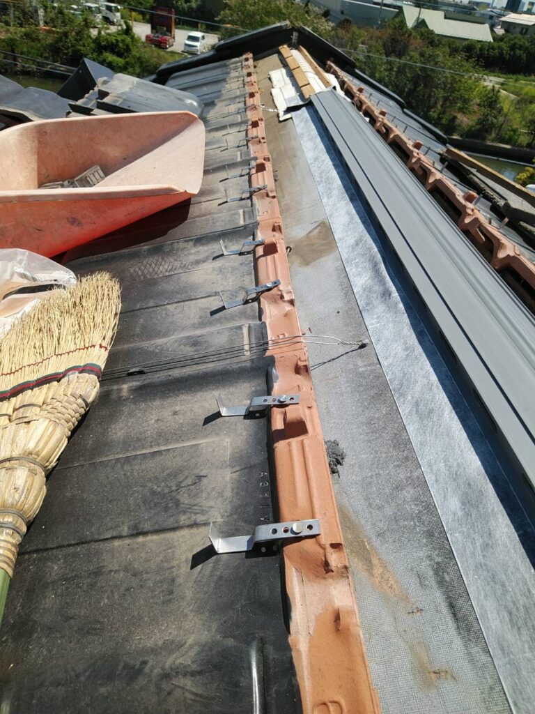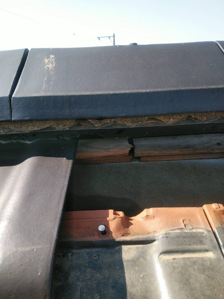 棟瓦の下にある平瓦が抜け落ち、ちょうど雪止め金具のところで止まっていたのを、施主様が発見され、当社にご連絡をいただきました。