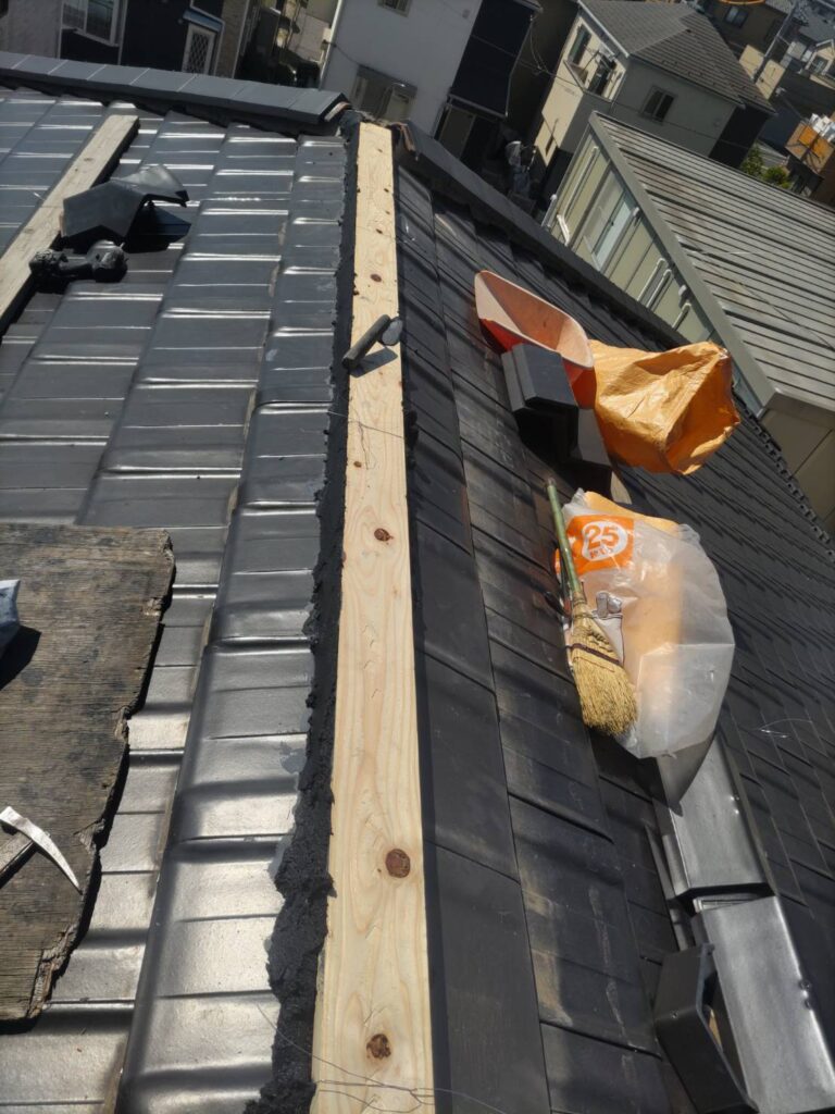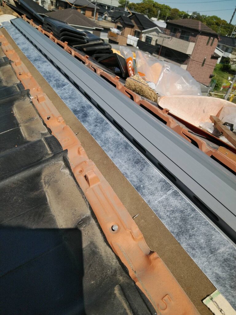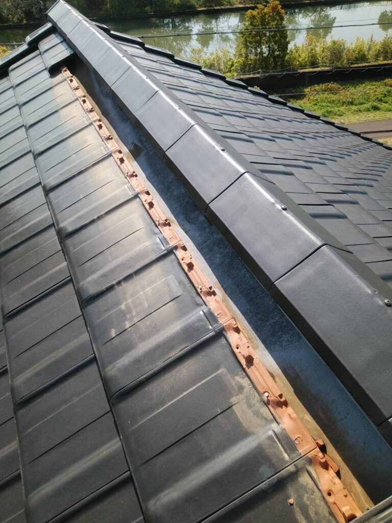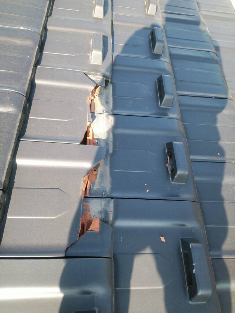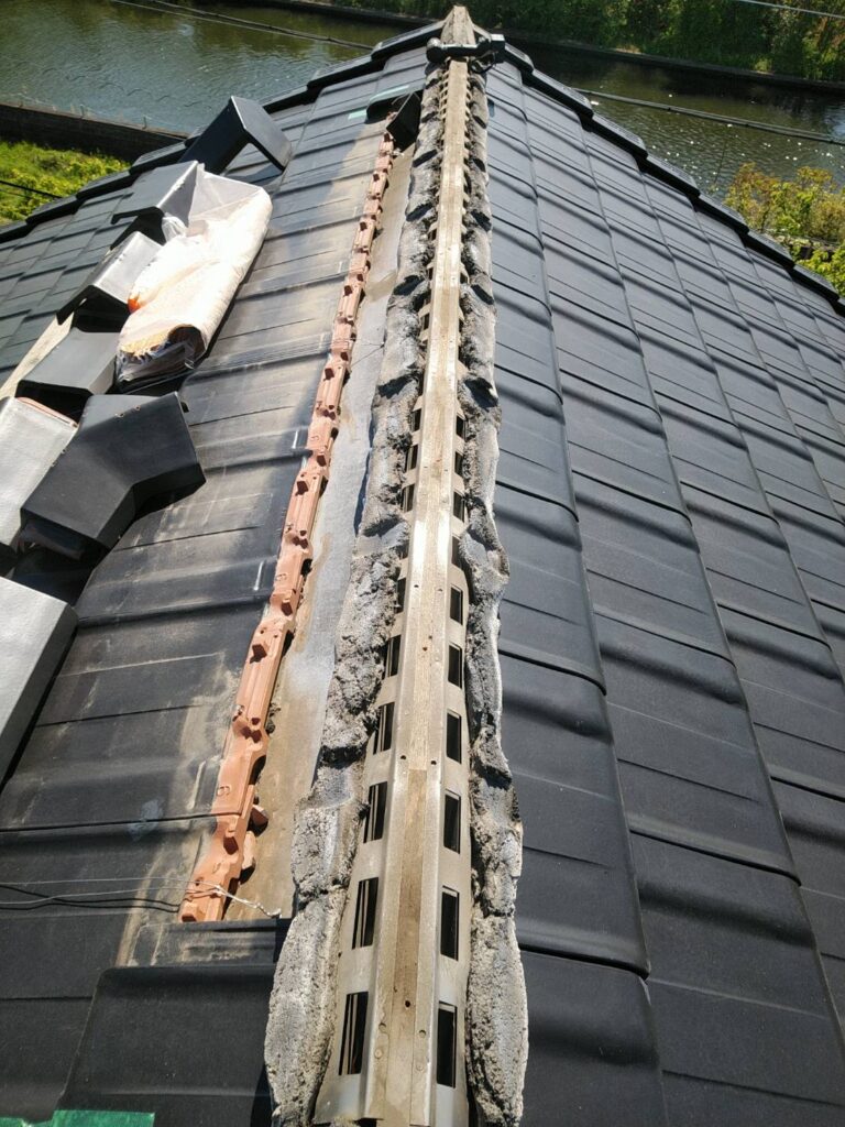 棟瓦の下にある平瓦が抜け落ち、ちょうど雪止め金具のところで止まっていたのを、施主様が発見され、当社にご連絡をいただきました。